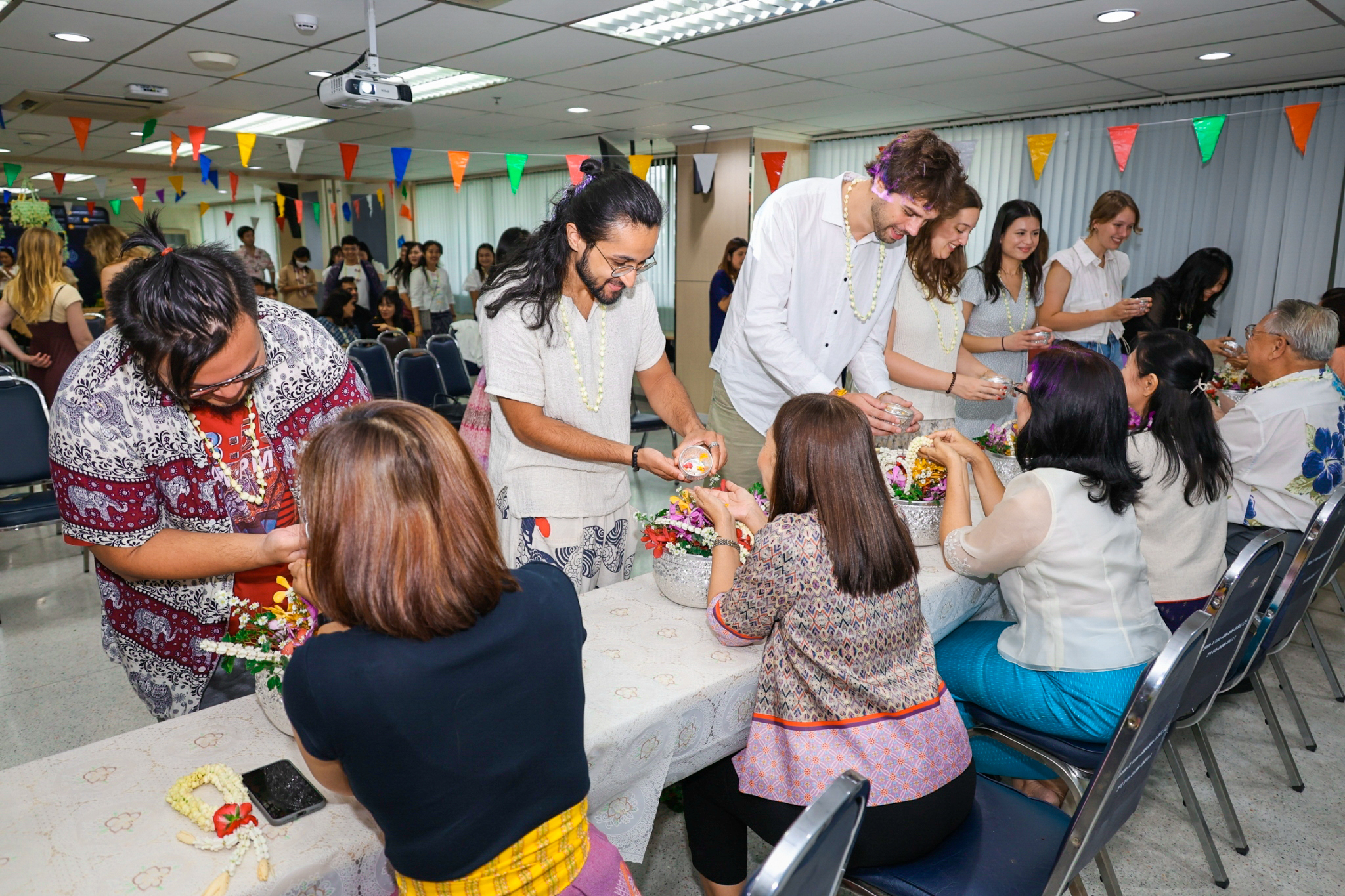 On this occasion, the faculty also organized the Songkran of the Faculty of Public Health. This year is very special because we have exchange students from Maastricht University who come to study elective courses together with international students, Master of Public Health in Global Health, Faculty of Public Health, since January 2024 until now. It's approximately 4 months. Surely, it is such a good opportunity for exchange students as well as international program students to participate in this activity in order to absorb Thai culture.