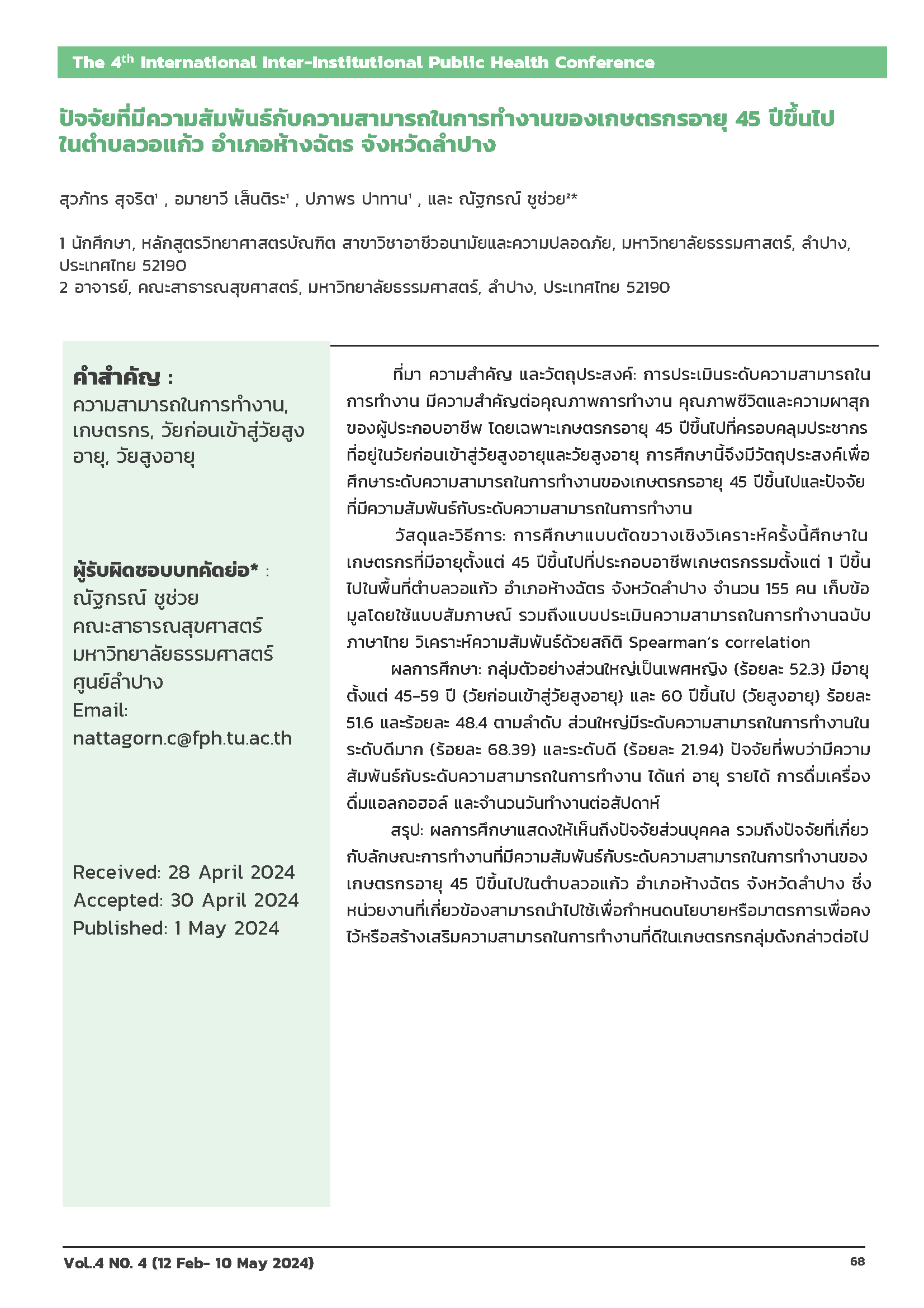 - ปัจจัยที่มีความสัมพันธ์กับความสามารถในการทำงานของเกษตรกรอายุ 45 ปีขึ้นไป ในตำบลวอแก้ว อำเภอห้างฉัตร จังหวัดลำปาง