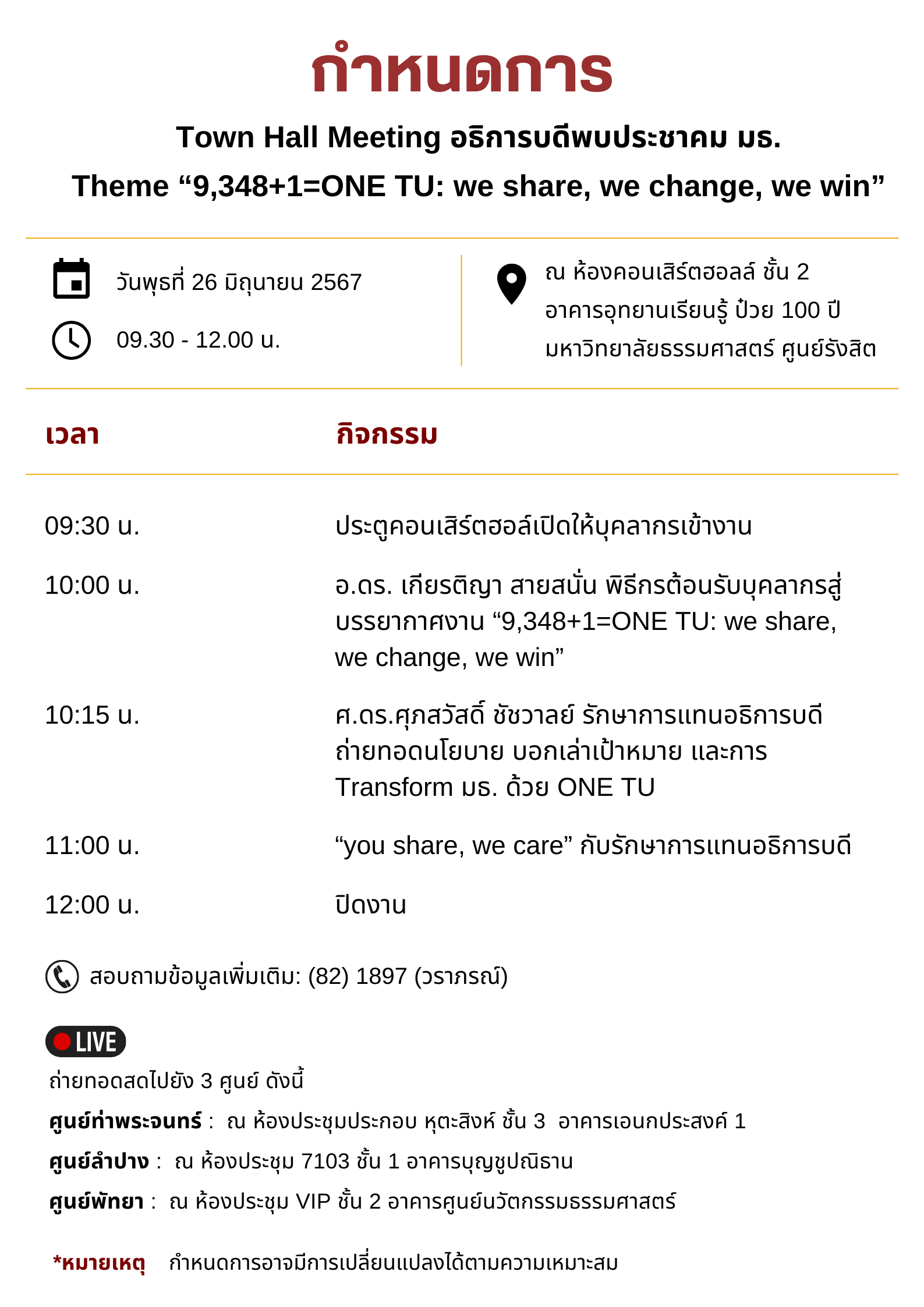 ขอเชิญประชาคมธรรมศาสตร์ ร่วมกิจกรรม Townhall Meeting อธิการบดีพบประชาคม มธ.