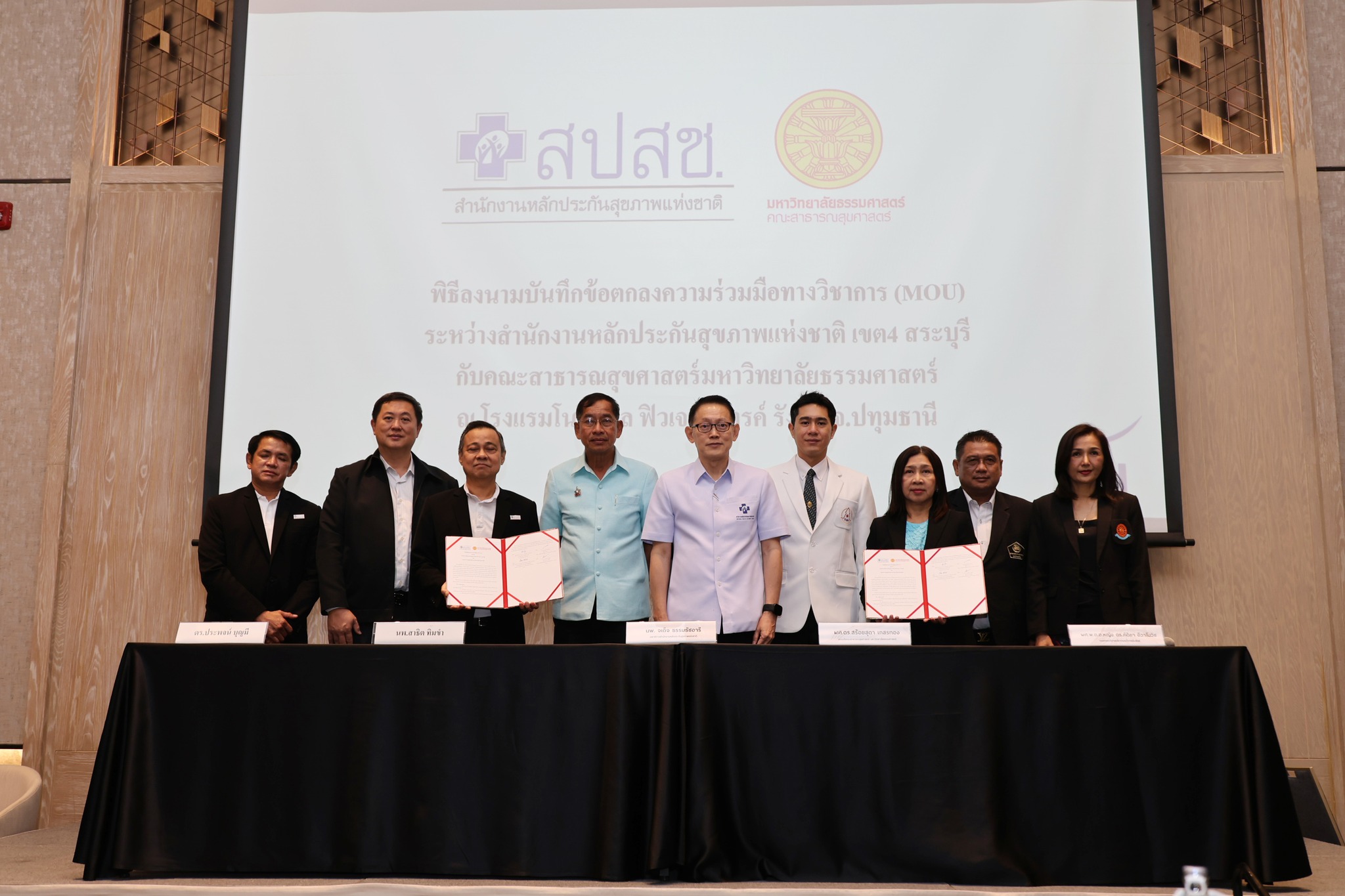 สำนักงานหลักประกันสุขภาพแห่งชาติเขต 4 สระบุรี (สปสช.) ร่วมกับคณะสาธารณสุขศาสตร์ มหาวิทยาลัยธรรมศาสตร์ (มธ.) จัดพิธีลงนามบันทึกข้อตกลงความร่วมมือทางวิชาการ (MOU) เพื่อสนับสนุนและพัฒนาศักยภาพบุคลากรในระบบหลักประกันสุขภาพแห่งชาติและระบบสุขภาพระดับท้องถิ่น วันที่ 4 กรกฎาคม 2568 ณ โรงแรมโนโวเทล ฟิวเจอร์พารค์ รังสิต จ.ปทุมธานี